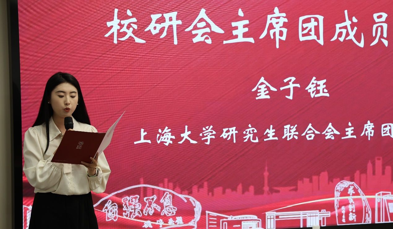 太阳成集团研究生联合会主席团成员金子钰同学代表校研会向本次大会致贺词。她肯定了学院研究生会过去一年在学术论坛、演讲大赛等活动中的成绩;同时寄语新一届研究生会成员,要用新媒体和沉浸式研学让思想学习入心,要凝聚力量精准服务研究生诉求,助力学校进行“双一流”建设。