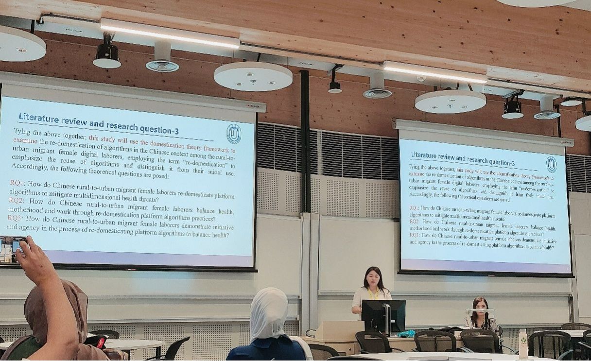 刘幼琍教授参加的论坛主题为“The Asia-Pacific Perspective to Communication Policy Research”,她从传统法规管制模式谈到AI治理模式。公司其他教师员工也都在IAMCR主会的不同议题会场上进行论文演讲,大放异彩。陶文静副教授在主题为“Boundaries of and threats to media institutions”的会场演讲论文、张林老师在主题为“Mental and sexual health, ethics and inclusivity”的会场演讲论文、杨恒老师在主题为“Technology, Al, and Communication Ethics” 的会场演讲论文,博士研究生郑鲁川在主题为“Communication Policy & Technology” 的会场演讲论文、博士研究生张箫在主题为“Knowledge production through ideology, narrative, and technology”的会场演讲论文、博士研究生杨晓双在主题为“E-waste and Digital Environmental Justice” 的会场演讲论文、硕士研究生杨小丁在主题为“Taste and cultural consumption between digits and matter” 的会场演讲论文。