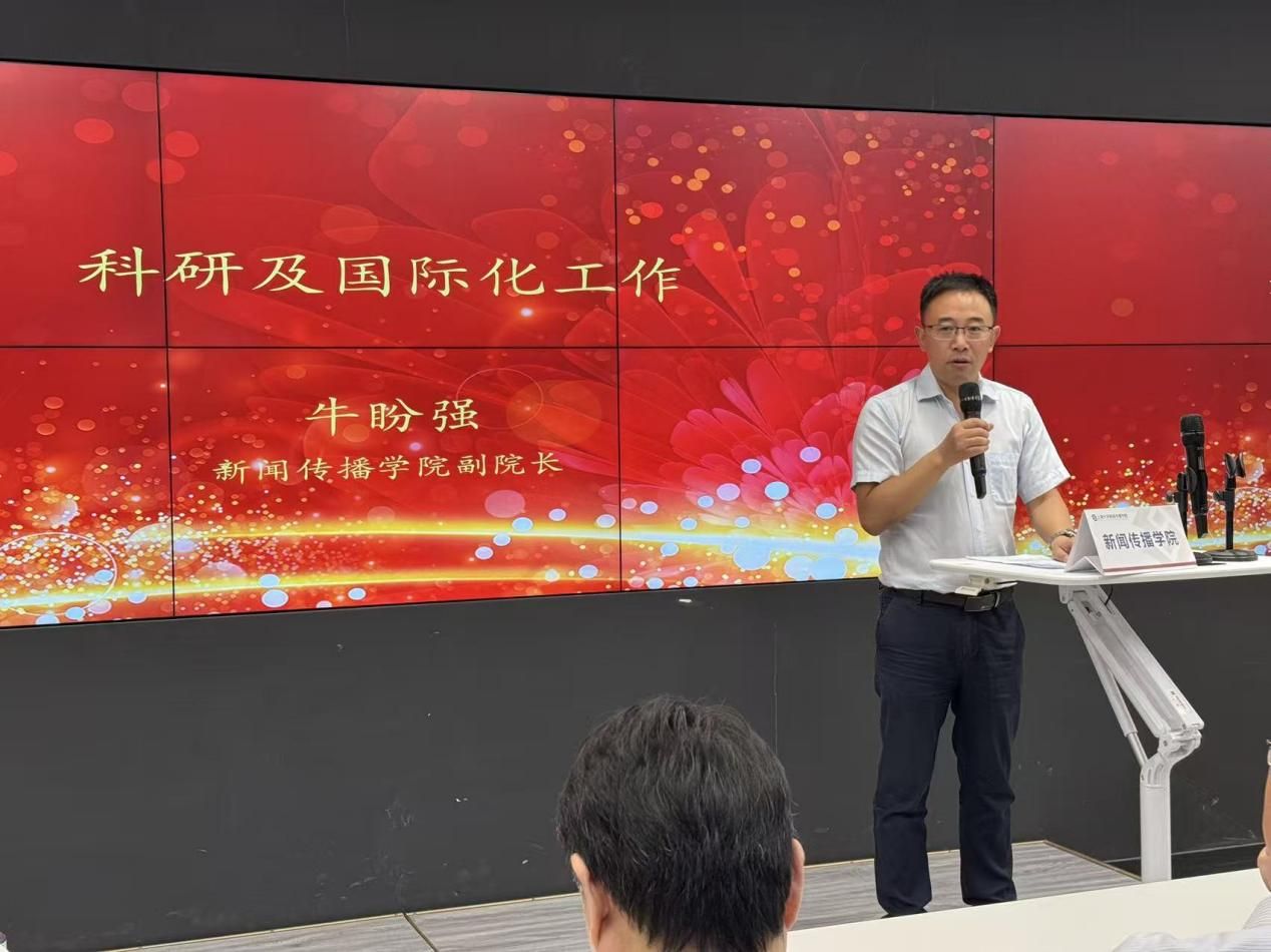 副经理牛盼强对学院2025年度上半年科研及国际化工作进行总结,从科研经费入账、项目课题申报、高水平论文发表到科研成果获奖等方面,全面回顾了工作成效。他提出,2025年度下半年将举办中国智能媒体传播论坛、科研创新大会、国家社科基金培育工作坊等学术活动,全方位培育和激励产生学院高水平科研成果,提升自身科研实力。