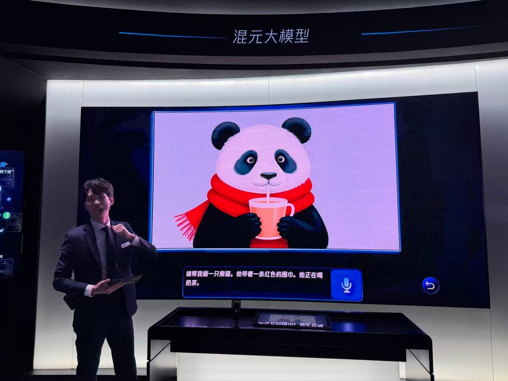 在人工智能展区,讲解人员利用混元大模型文生图功能,通过语音指令,现场生成一张大熊猫戴围巾喝奶茶的萌图。“ima、腾讯元宝、腾讯混元被称为腾讯AI三件套,其中混元是腾讯自研的底层大模型,是驱动元宝、ima等AI应用的‘技术大脑’,具备强大的多模态能力。”讲解人员告诉大家。